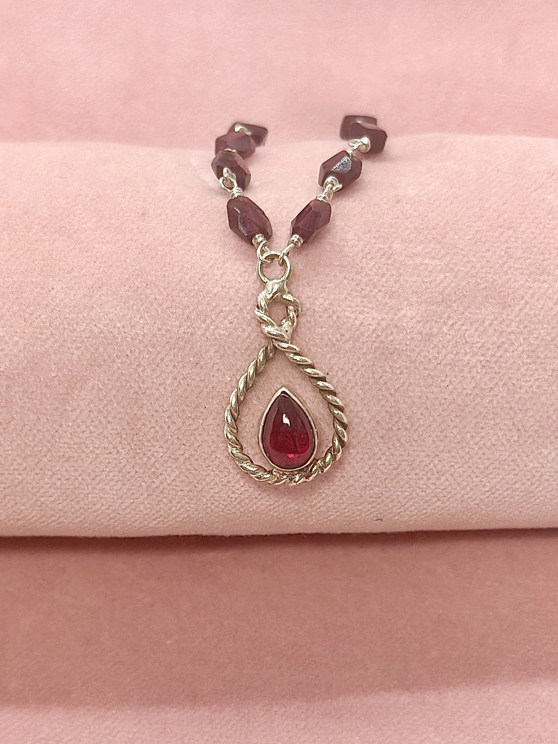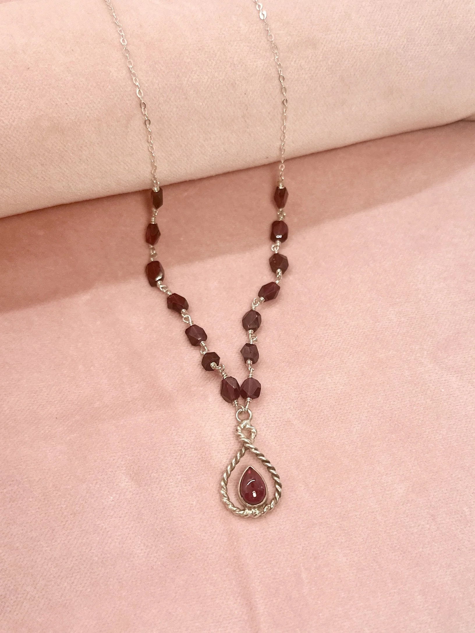 Vintage Sterling Silver Garnet Pendant dangled from 18 inch necklace with Garnet beads.